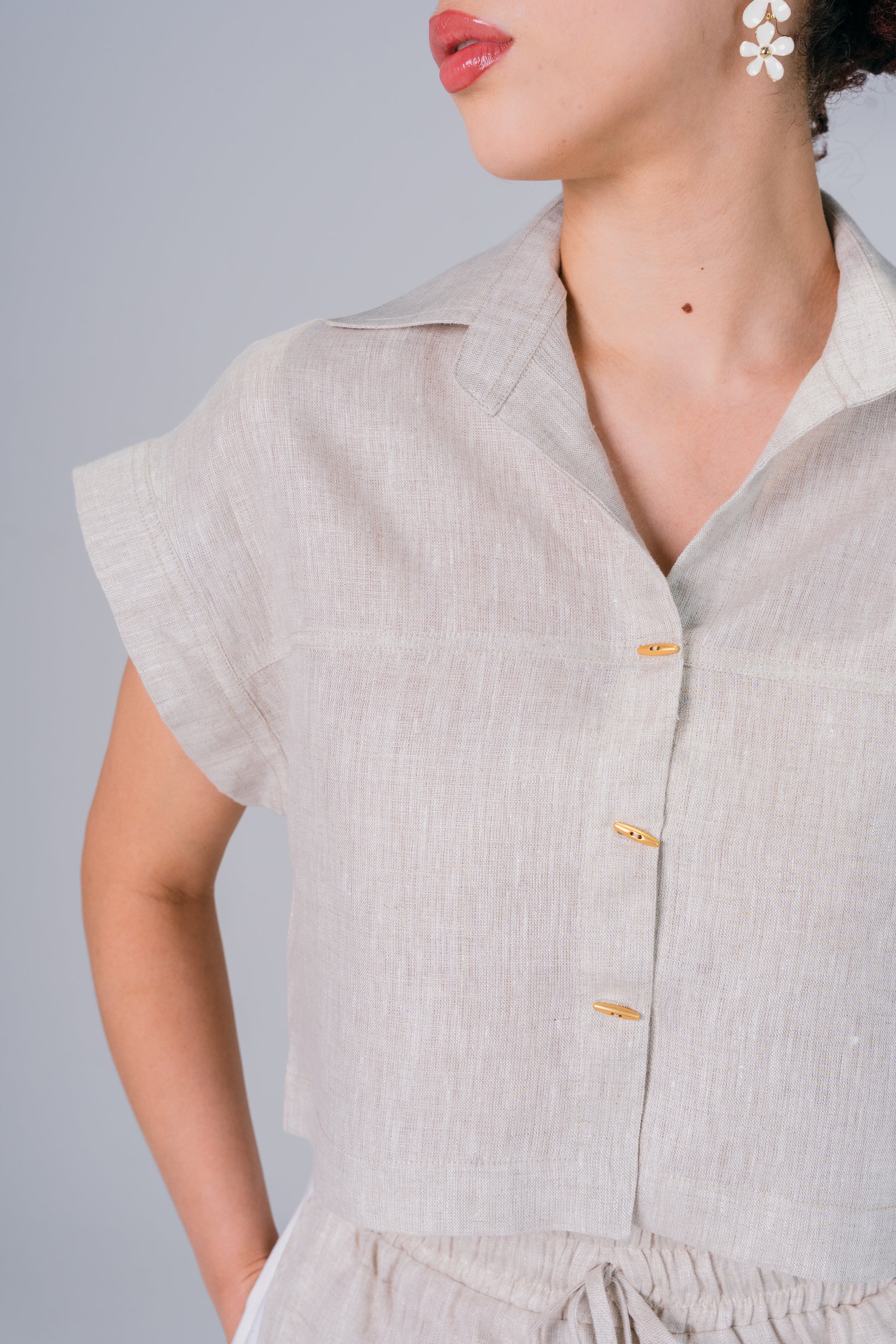 Blusa confeccionada en lino puro Italiano. Su corte la hace versátil para diferentes ocasiones, mientras que el botón dorado añade un detalle de lujo que eleva cualquier conjunto. Perfecta para climas cálidos.