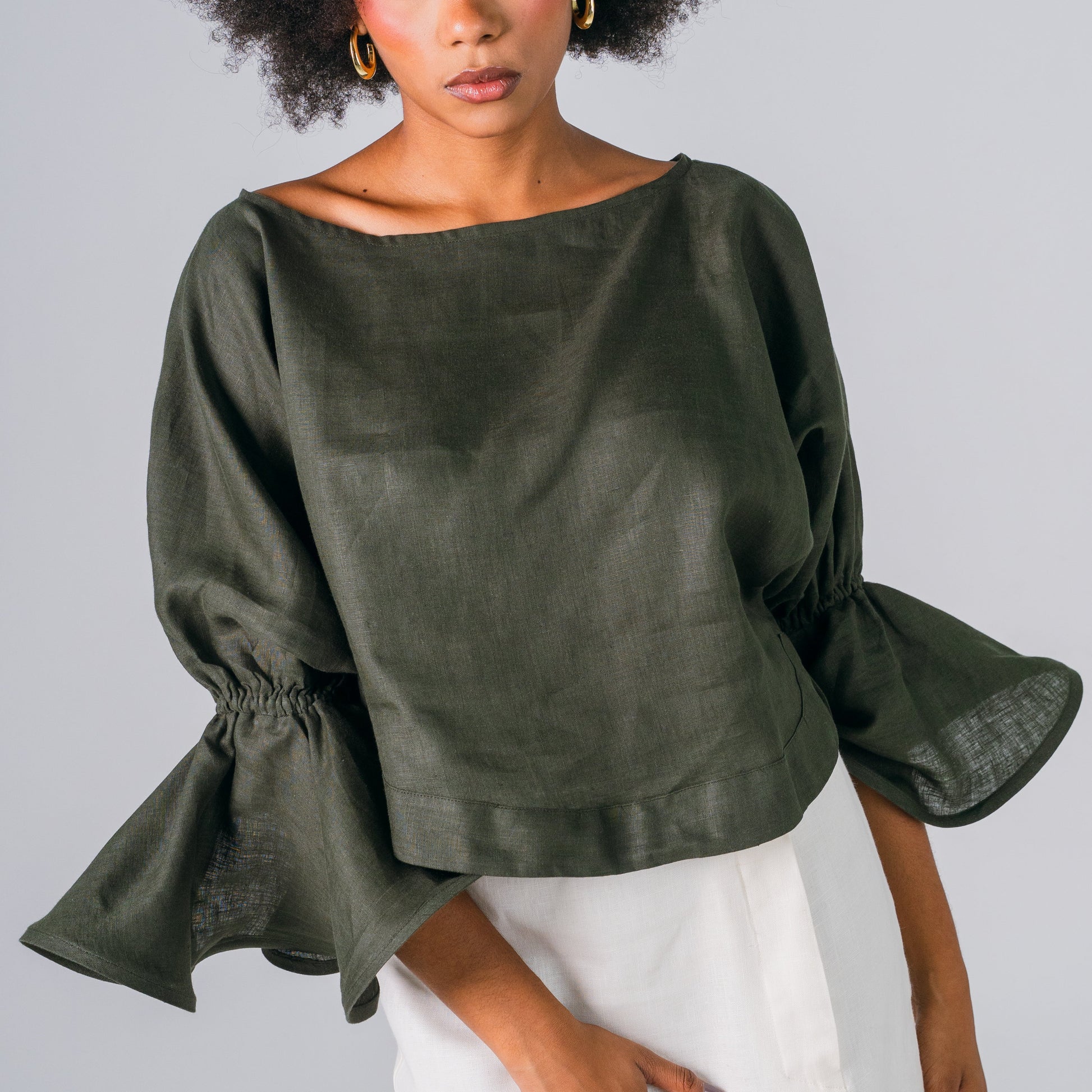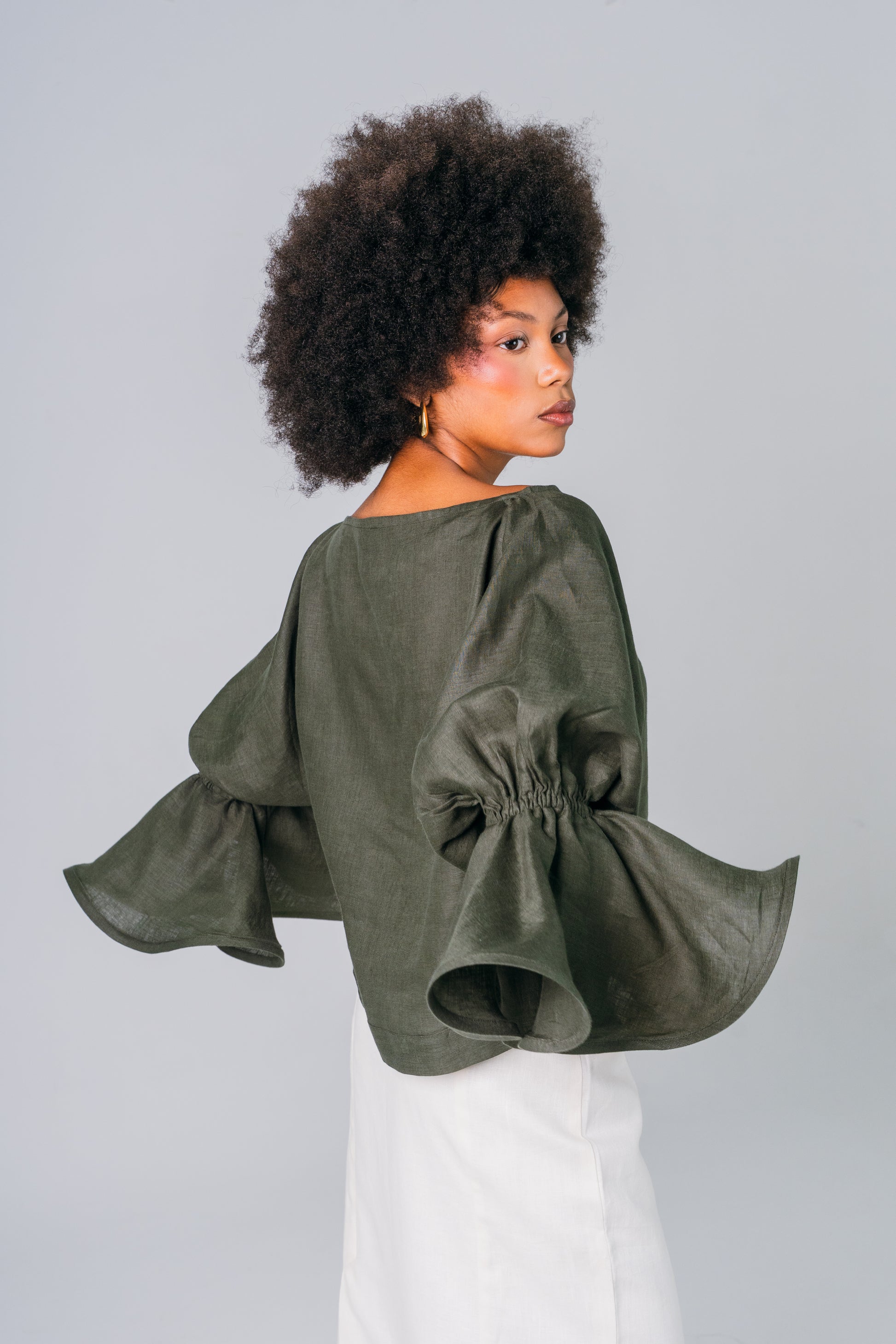 Blusa Giustiv en tela al sesgo con manga corrida y puños boleros en verde. Diseño versátil de talla única, ideal para talles S-M. Prenda sofisticada que combina comodidad y elegancia, perfecta para looks casuales o semi-formales. Su corte fluido y detalles en los puños le dan un toque distintivo y moderno.